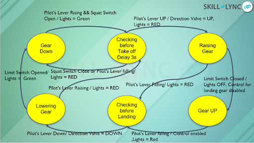 You will have to develop a code using C programming to control the retraction and extension of an airplane’s landing gear. The objective of this project is to implement logic for extending and retracting gears using a Finite State Machine Algorithm in C language.