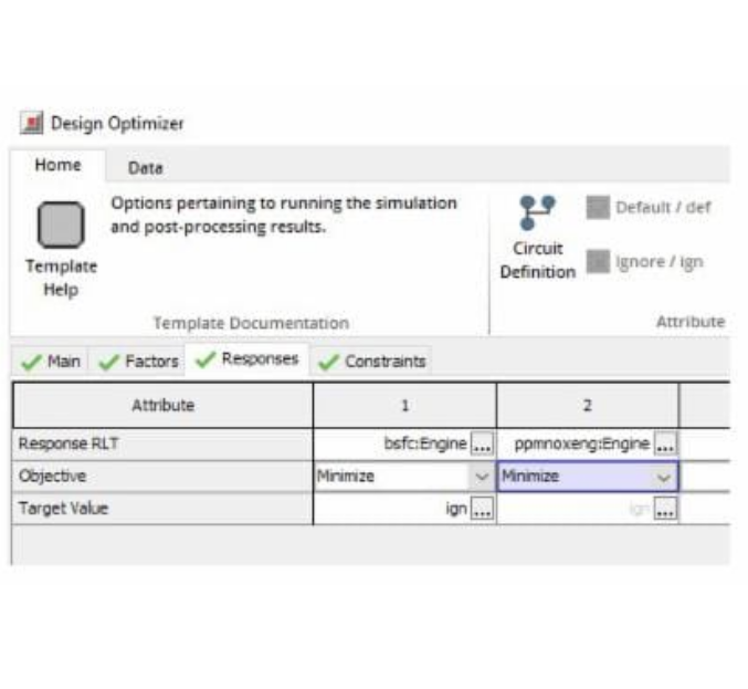 Fix the target goals for the optimization of the rail pressure and start of injection values to get the suitable BSFC and Nox responses