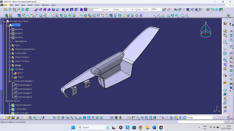 Step 1: Creation of Product File and Part File The door trim panel contains input of different surfaces. To work on these surfaces one new product file under assembly workbench is open. In this product file new part are added and the surfaces from original part file are separated and named as Master Section, Arm Rest,…